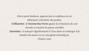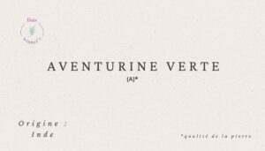 L’aventurine verte est une variété de quartz, principalement composée de silice (SiO₂) avec des inclusions de fuchsite, qui lui donnent sa couleur distinctive. Elle se forme généralement dans des roches métamorphiques et peut être trouvée dans des régions telles que le Brésil, l’Inde et les États-Unis.